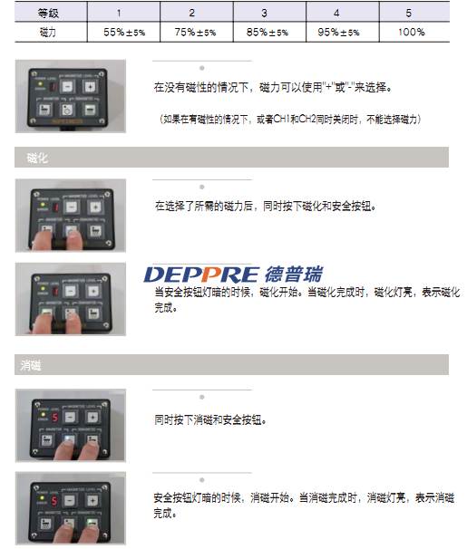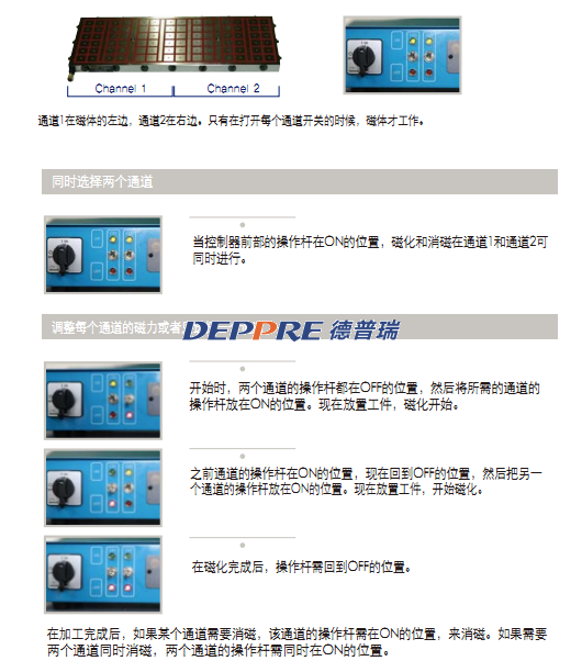 磁化和消磁可在中間分開的通道1和通道2,獨(dú)立進(jìn)行。每個通道可選擇不同的磁力,分開使用: